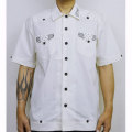 オリジナルキューバシャツから新作登場!! クロス&ペイズリーが両サイドポケットにデザインされ、 襟元にはブランドロゴ・バック右下にはパイプロゴが刺繍されております。 各箇所22個のOGオリジナルボタンを始め 全てにこだわり、さらに着易さを求めた生地は1から10まで丁寧に生産されており 通常のキューバシャツの良い風合いを残しつつ、アロハ風にも着こなしが可能です。 普段着としても、イベント等の場でもバッチリ主張出来るアイテムに仕上がっております♪ ●MODEL:身長172cm/体重65kg/Lサイズ着用 |